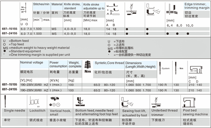 優(yōu)點(diǎn): ●柱式底板便于擺放衣片 ●通過下送布,針?biāo)筒己涂刂迫谖坏膲耗_上送布分配起皺量 ●起皺量的控制和松線裝置(手動(dòng)或自動(dòng))確保了高質(zhì)量的縫紉效果 ●切邊(697-24155)有不同的切邊寬度 ●堅(jiān)固耐用的設(shè)計(jì)