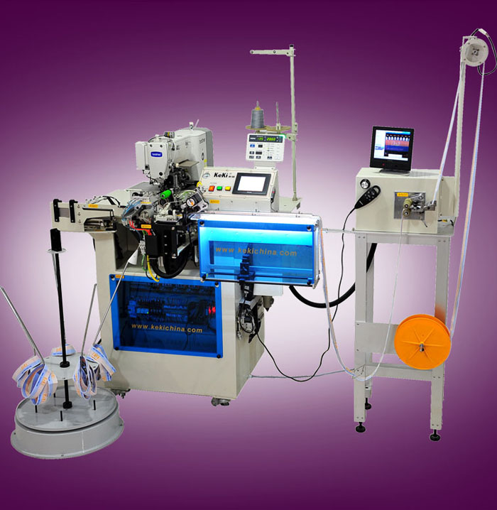 KEKI高速自動拼接橡筋機XJ-311H/CCD智能化電子眼代替人眼識別橡筋帶logo及字母位置,精準(zhǔn)對齊。高速自動化一次性完成剪裁、拼接、多針縫制和自動收料,實現(xiàn)高產(chǎn)能。
