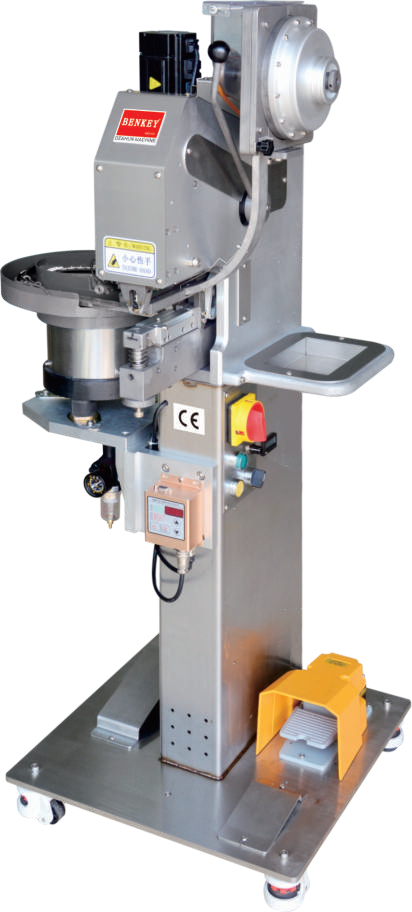 把鈕扣放進(jìn)對(duì)應(yīng)的2個(gè)料斗,開機(jī)會(huì)自動(dòng)轉(zhuǎn)動(dòng)料斗,自動(dòng)把鈕扣排滿軌道,自動(dòng)把鈕扣送到上下模具,伺服電機(jī)驅(qū)動(dòng),只要踩下踏腳開關(guān)便可裝訂自如,簡(jiǎn)單易用。更換配件可以裝訂其它鈕扣。