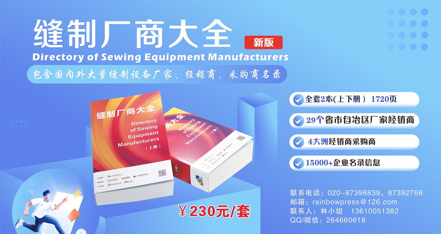 另外,公司聯(lián)合廣東省縫制設(shè)備商會(huì)等單位出版了行業(yè)信息量最大的企業(yè)名錄--《縫制廠商大全》。《縫制廠商 大全》分為上、下冊(cè),共收錄了全國各省、市及港臺(tái)地區(qū)縫制設(shè)備生產(chǎn)企業(yè)及經(jīng)銷代理商名錄資料近8200家;另 外還收錄了亞洲各國縫制設(shè)備采購商資料近1200家,南美、北美、歐洲、非洲及大洋洲縫制設(shè)備采購商資料1200 多家。中國縫制機(jī)械協(xié)會(huì)理事長田民裕為《縫制廠商大全》題序,序中提到:“《縫制廠商大全》的出版將是我 國縫制機(jī)械行業(yè)信息查詢工具多元化發(fā)展的又一補(bǔ)充,也填補(bǔ)了縫制設(shè)備行業(yè)黃頁類工具書籍的空白。《縫制廠商大全》涵蓋了國內(nèi)外各地的縫制設(shè)備廠商及采購商名錄,其內(nèi)容全面、信息完整,是人們查閱、了解國內(nèi)外各地區(qū)行業(yè)廠商的重要工具書籍。”